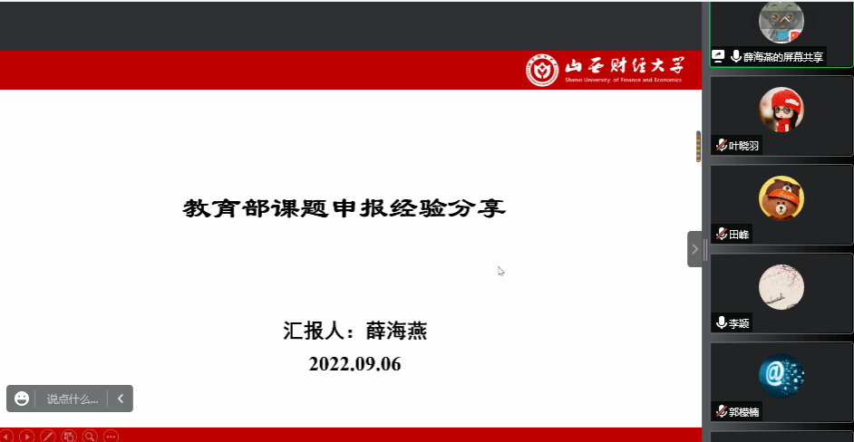 薛海燕老师分享了教育部课题《创新信息披露促进了企业创新吗—双向溢出视角》的申报历程和心得。主要从以下两方面展开讨论:(1)申报历程:申报课题需要长时间的构思和写作,要聚焦研究问题,理清研究思路。同时也要关注课题的实践意义和理论价值;(2)申报心得:课题申报要做到边写、边改、边构思,追踪时事、时政热点。同时要做到深耕研究领域,有机结合热点问题,并且在文献中挖掘理论创新,思考边际贡献是否有应用价值。最终呈现的研究内容要聚焦、充实、系统,研究思路要清晰,逻辑性要强,研究方法要服务于研究内容,适当引入新方法和关键变量可测量。