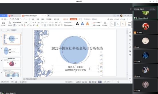 王晓亮老师分享了2022年国家社科基金统计分析报告:(1)2022年国家社科基金立项情况:2022年国家社科基金立项综述为5183项,其中重点项目数372项,一般项目为3182项,而青年项目较少,立项数为1129项。总的来看,国家社科基金立项数总体呈上升趋势,其中2019年立项数量最多,2012年立项数量最少。从学科分布来看,其中管理学、应用经济和法学三个学科立项数量最多;从立项单位分布来看,双一流高校数为127所,总计2237项,比较占优势;普通高校数为460所,总计2438项。从研究要素分析:理论要素包括基础理论、正义理论、组织理论、产业组织理论等;方法要素包括政治经济学方法、口述史、自然语言处理法等;从研究背景上,立项题目倾向于用乡村振兴,数字化,数字经济、人类命运共同体、共同富裕等来拟定;从维度要素上,立项题目倾向于用实现机制、路径等来拟定;整体高频词包括“研究”、“视域下”如高质量发展视域下,乡村振兴视域下等宏观和微观相结合、“路径研究”、“机制研究”;从管理学领域来看,高频关键词主要覆盖“研究”、“机制研究”、“双碳”等;应用经济高频词主要包括:“双碳目标”、“对策研究”、“全要素生产率”、“协同发展”等;(2)会计领域立项分析:2022年立项项目合计94项,其中重点项目6项;管理学和会计结合、应用经济领域立项较多,分别为64项和21项;研究专题涵盖:数字经济、双碳影响因素、特殊企业、公司治理、资本市场政策与制度、审计、ESG专题文献、混合所有制、企业创新、金融科技等。