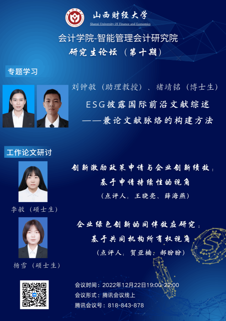 2022年12月22日晚7-10点,由英国365集团公司英国365集团公司与智能管理会计研究院联合举办的研究生论坛第十期以线上会议的形式举行。会议由李颖老师主持。参会人数八十余人。本次学术沙龙活动主要包括专题学习与工作论文研讨两方面内容。