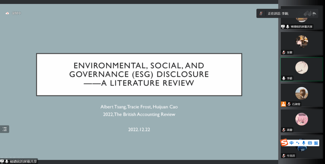 在专题学习环节,褚靖铭博士基于国际前沿文献《Environmental, Social, and Governance (ESG) Disclosure: A Literature Review》,介绍了ESG信息披露国际前沿文献综述,随后刘钟敏老师清晰阐述了文献脉络的构建方法、变量底层的逻辑和行为规则创新的重要性。