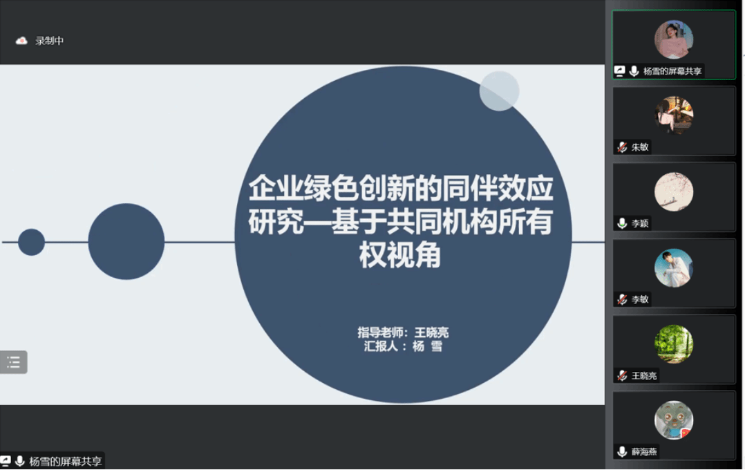 第二篇工作论文研讨了杨雪硕士的《企业绿色创新的同伴效应研究:基于共同机构所有权视角》,郝盼盼与贺亚楠两位老师进行点评。郝盼盼老师指出:文章的题目表述不太准确,副标题是本文的自变量,不是视角问题;本文关注的机制无法证明是行业自身带来的影响还是共同机构带来的影响;缺乏创新点,建议突出协同治理机制,或者从绿色创新方面建立创新点;研究设计中,大量样本共同机构所有权是0,会影响实证结论;控制变量选取缺少以往文献常见的变量;同伴效应和同群效应概念要区分,建议在全文统一。贺亚楠老师指出:文章的边际贡献要重新思考和梳理;理论分析提到机制作用的三个链条,建议在实证中全部检验;样本中只有9.3%有共同机构所有权持股,后两个连续变量取值大部分都是0,采用普通回归不合适;对于实证结果的解释要严谨,实证没有证明的链条不应出现在结果解释部分。