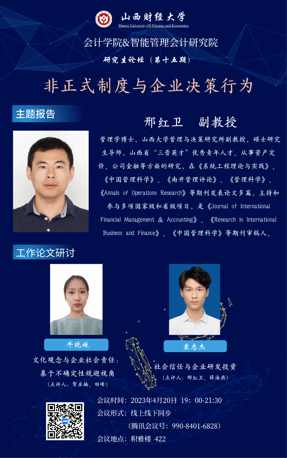 2023年4月20日晚7点至9点半,由英国365集团公司与智能管理会计研究院联合举办的研究生论坛(第十五期)以线下线上两种方式同步举行。本次学术论坛的主题为“非正式制度与企业决策行为”,轮值主持人为智能与成本管理教研室主任贺亚楠副教授、副主任田峰博士,论坛特别邀请山西大学管理与决策研究所邢红卫副教授做主题报告。
