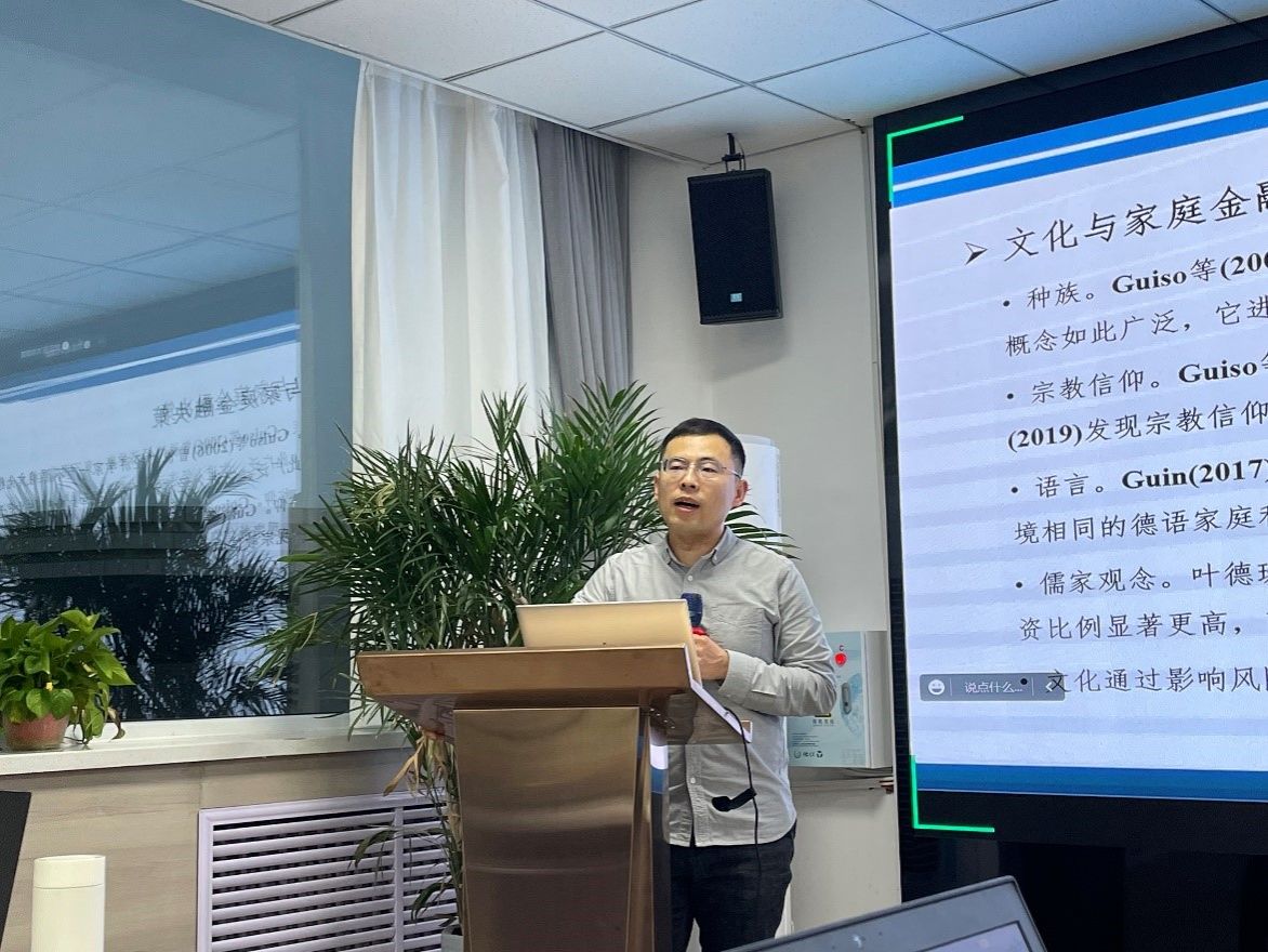 在专题报告环节,邢红卫副教授从生活中大众更愿意挑选带6和8的车牌号、不愿意买18楼和杭州“凶宅”拍卖的案例引入,进行以文化与金融决策为主题的讲座。讲座以主要从以下三方面进行探讨:文化与家庭金融决策、文化与分析师报告、文化与企业投资决策。文化与家庭金融决策方面,邢老师从种族、语言和儒家观念三方面进行分析;文化与分析师报告方面,从文化属性之间的认同角度切入,以文化认同——信任偏差——预测报告——市场反馈路径阐述;企业的文化与投资决策从两个维度考虑:风险承担和测量董事会或管理层文化多样性,每个维度又细分了许多方面讨论。讲座精彩纷呈,对文化的构建引发了在场师生的热烈探讨,启发了大家对文化刻画、文化与本专业选题融合等后续研究问题的思考。