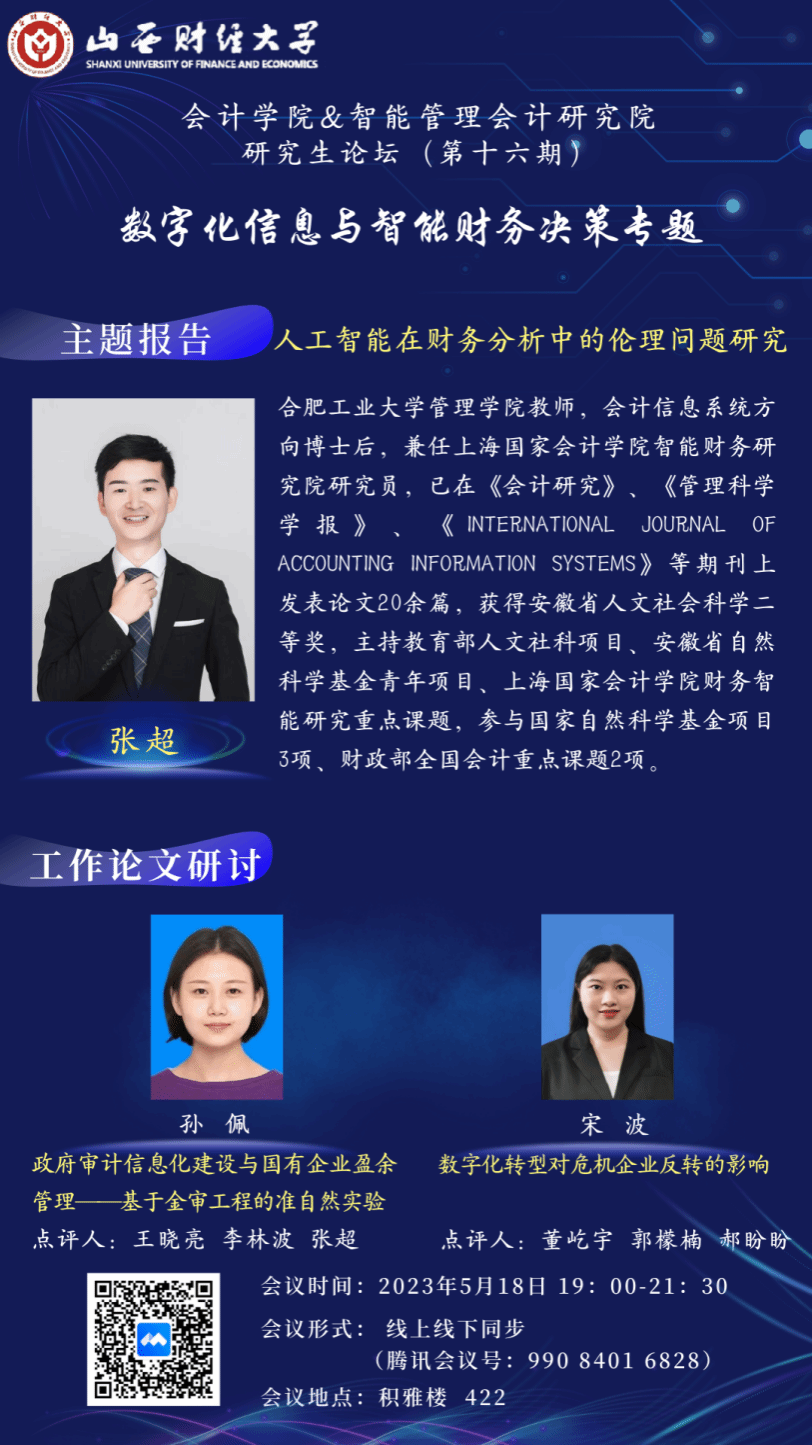 2023年5月18日晚7点至10点,由英国365集团公司与智能管理会计研究院联合举办了研究生论坛(第十六期)。本次论坛的主题为“数字化信息与智能财务决策”,采取线下与线上同步的方式。轮值主持人为英国365集团公司财务管理教研室主任郝盼盼副教授,论坛特别邀请合肥工业大学管理学院教师、上海国家英国365集团公司智能财务研究院研究员张超博士后做讲座。