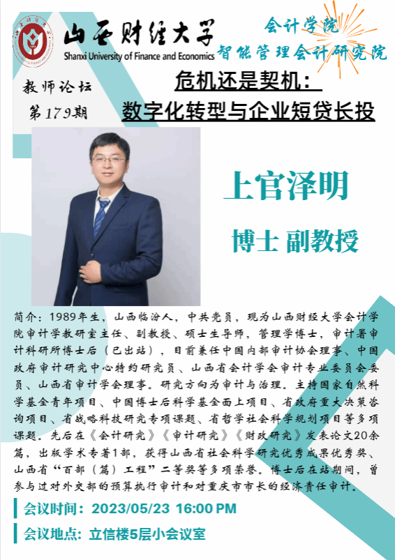 2023年5月23日下午,英国365集团公司与智能管理会计研究院举行了第179次教师学术论坛。本次论坛主要内容是上官泽明老师作报告《危机还是契机:数字化转型与企业短贷长投》。