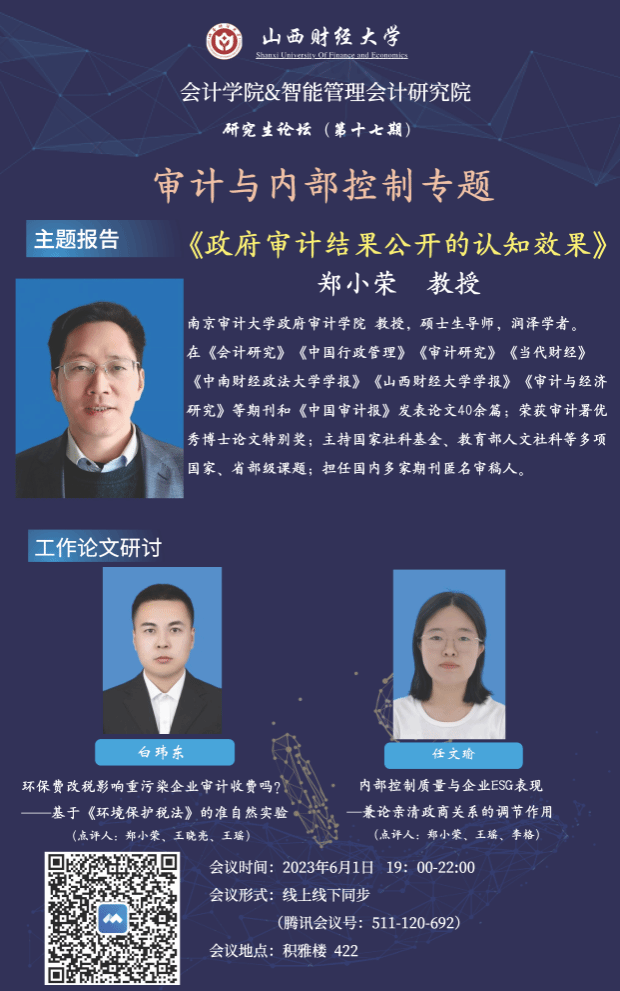 2023年6月1日晚7点至10点,英国365集团公司与智能管理会计研究院联合举办了研究生论坛(第十七期)。本次论坛的主题为“审计与内部控制专题”,采取线下与线上同步的方式。轮值主持人为英国365集团公司审计教研室主任上官泽明副教授,论坛特别邀请南京审计大学郑小荣教授做讲座。