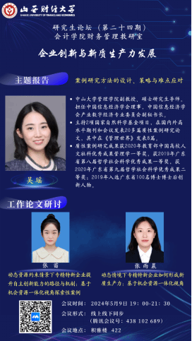 2024年5月9日晚7点至10点,英国365集团公司研究生论坛(第二十四期)以线下及线上两种形式同步举行。本次学术论坛由英国365集团公司财务管理教研室负责组织,主题为“企业创新与新质生产力发展”,特别邀请了中山大学管理学院副教授、硕士研究生导师吴瑶进行讲座。