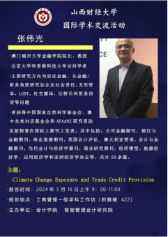 5月16日上午澳门城市大学金融学院经理张伟光教授做题为《气候变化风险敞口和贸易信贷提供》的专题讲座。首先,张伟光教授的论文研究了气候变化敞口与贸易信贷供应之间的关联,并提出两个假设:气候变化风险敞口可以促使企业提供更多贸易信贷,或减少为客户提供的贸易信贷。其实证结果支持了第一个假设,即气候变化风险敞口可以促使企业提供更多的商业信贷,且对财务上更灵活、业绩不佳或声誉较差的公司影响更大。其次,张教授还列举了与该文研究相似或题目的文章,介绍了该文与以往研究在数据选取、变量测度设定、研究结论、研究背景等方面存在的差异。再次,张教授介绍了多种内生性问题的审查方法和灵敏度测试的方法。最后,张教授对文章做出总结,该文研究了企业的气候变化风险敞口如何影响其贸易信贷准备金,以及如何通过提供贸易信贷的动机来解释气候变化风险敞口的影响。强有力的证据表明,面临更大气候变化风险的公司更有可能向其客户提供贸易信贷。实证分析揭示了推动气候变化风险敞口与贸易信贷供应正相关关系的流动性、财务业绩和声誉损失等潜在机制。