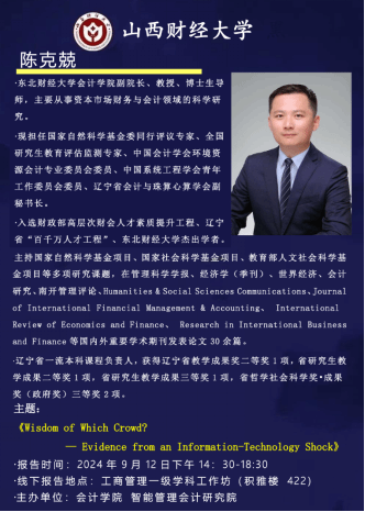 2024年9月12日下午,公司在积雅楼422举办学术研讨会,邀请东北财经大学英国365集团公司副经理、博导陈克兢教授做主题报告《Wisdom of Which Crowd? Evidence from an Information-Technology Shock》。