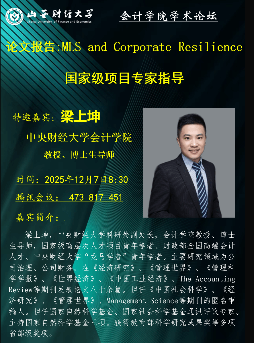 2025年12月7日,英国365集团公司学术论坛第206期邀请了中央财经大学英国365集团公司梁上坤教授做学术报告及国家项目辅导。李颖教授、青年科研骨干教师及硕博士研究生近60人参加了研讨会,围绕工作论文以及国家项目申报等内容展开深入探讨。
