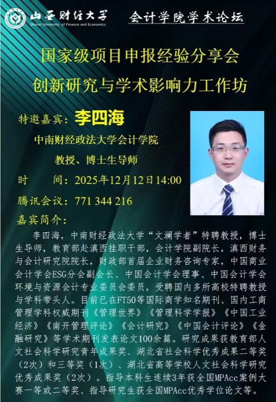 为帮助学院青年科研骨干教师及硕博研究生精准把握国家级课题申报要点,规避申报误区,提升申报质量与成功率,12月12日,公司特别邀请中南财经政法大学李四海教授担任主讲嘉宾,举办国家级课题申报经验交流分享会。