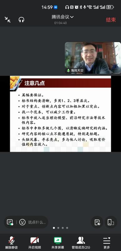在主题分享环节,李四海教授结合自身多年来成功申报并主持多项国家级科研项目的丰富经验,进行了系统而深入的剖析。他从“项目选题的前瞻性与创新性”、“申报书撰写的逻辑框架与核心要点”、“研究团队的组织与协同”、“研究基础与可行性的有效呈现”以及“评审视角下的常见问题与规避策略”等多个维度,进行了层层递进、细致入微的讲解。李教授的讲解不仅理论联系实际,更穿插了大量生动具体的案例,将申报过程中关键环节的把握、难点问题的化解策略娓娓道来,其见解独到,语言风趣,受到了师生的一致好评。此外,李四海教授聚焦国家自然科学基金、国家社会科学基金等重点项目的申报政策与评审标准,分享了核心竞争力打造技巧。他强调,国家级项目申报需注重细节把控“与”差异化优势”,从申报书的格式规范、语言表达,到研究团队的配置、前期研究基础的呈现,都需精心打磨。李教授还针对青年教师的申报痛点,提供了个性化建议,鼓励青年学者立足自身研究方向,积累前期成果,敢于突破创新。