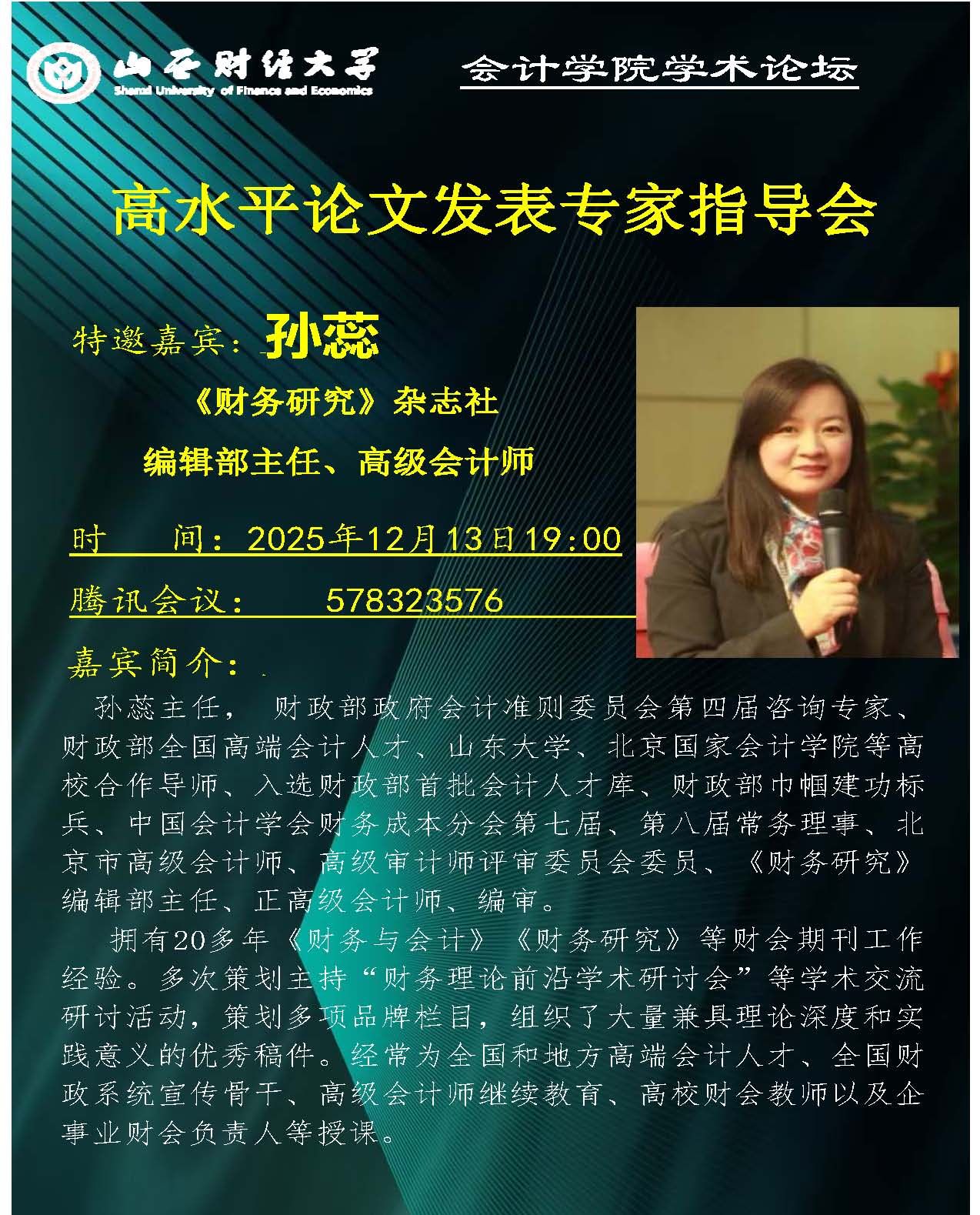 2025年12月13日晚19:00,英国365集团公司学术论坛第216期在线上如期举行。本期论坛特邀《财务研究》编辑部孙蕊主任担任主讲嘉宾,为学院师生带来一场题为“高水平论文发表专家指导会”的学术报告。论坛由公司王晓亮教授主持,学院青年科研骨干教师及硕博研究生共计50余人齐聚一堂,围绕这一主题展开了深入的学习与交流。