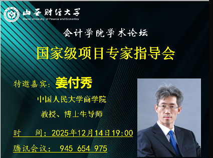 2025年12月14日晚19:00,英国365集团公司学术论坛第217期通过腾讯会议如期举行。本期论坛特邀中国人民大学商学院姜付秀教授担任主讲嘉宾,为学院教师进行国家级项目申报专题辅导。论坛由公司王晓亮教授主持,学院青年科研骨干教师及硕博研究生共计60余人齐聚一堂,围绕国家级科研项目申报这一主题展开了深入的学习与交流。