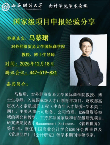 为切实提升国家级科研项目申报质量,助力青年教师精准把握选题方向与论证要领,2025年12月18日,公司成功举办国家级科研项目申报深度指导会。会议特邀对外经济贸易大学马黎珺教授担任指导专家,与我校青年科研骨干教师、硕博研究生进行深入交流,为参会人员带来专业细致的申报指导与经验分享。