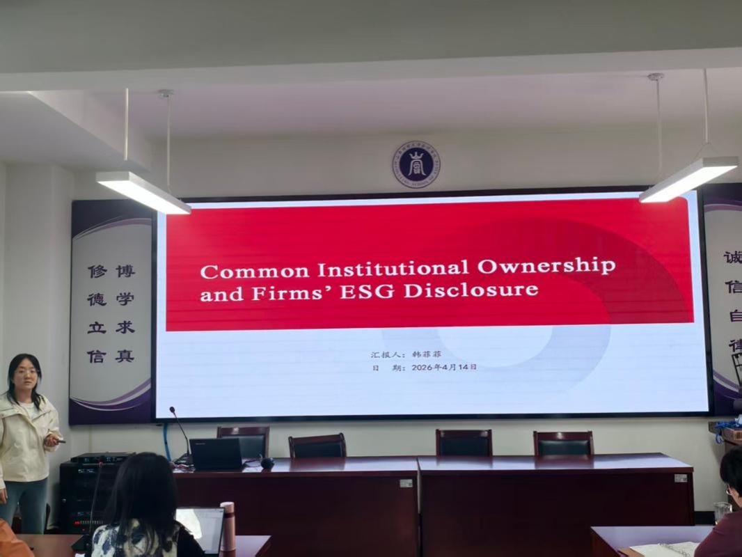 随后,韩菲菲博士分享了题为《共同机构所有权对企业ESG信息披露的影响》的英文工作论文。研究基于2011-2023年A股上市公司数据,论证了共同机构所有权通过降低行业竞争专有成本、增强治理效应及强化退出威胁机制显著提升了企业ESG信息披露水平,且该效应在管理层视野长期、环境监管严格及被动型基金持股的情况下更为明显,最终有助于改善股票流动性。参会师生对论文展开深入交流并提出一系列重要修改建议。李颖教授等专家指出在理论逻辑上存在共同机构合谋从而抑制ESG信息对外公开披露的竞争性假说;研究设计上建议将样本区间缩短至2018年后以匹配中国ESG规范进程、建议采用Heckman两阶段模型并更换工具变量以缓解内生性问题;还建议增加ESG漂绿检验;结合2026年强制披露政策与“耐心资本”等国家战略以增强该研究的现实意义。
