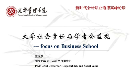 北京大学光华管理学院王立彦教授在西藏拉萨通过视频连线,作了题为“大学社会责任与学者公益观”的专题演讲。王教授通过将国内外大学社会责任与企业社会责任进行比较,指出在经济社会领域,企业社会责任理念已被广泛接受,并较好地落实到企业战略规划和运营中,但大学社会责任较少被谈及。他倡导“大学社会责任观”,呼吁大学应当把责任、公益和社会价值理念融入教学,认为财经学者眼中的公益应当具有专业性公益、学术性公益和慈善性公益三个方面。