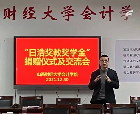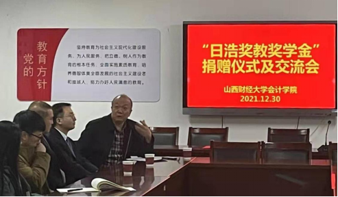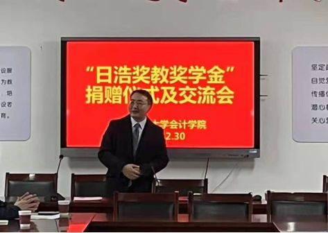 邓达奇博士介绍日浩奖教奖学金的初衷与筹备情况,表达了对母校和会计公司、学子们的赤诚关切之心,积极回馈之意,