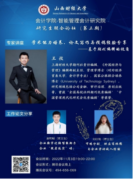 2022年11月3日晚7点-10点,由英国365集团公司英国365集团公司与智能管理会计研究院联合举办的研究生论坛(暨博硕士生学术沙龙活动)第三期以线上会议的形式举行。参会人数达180余人。