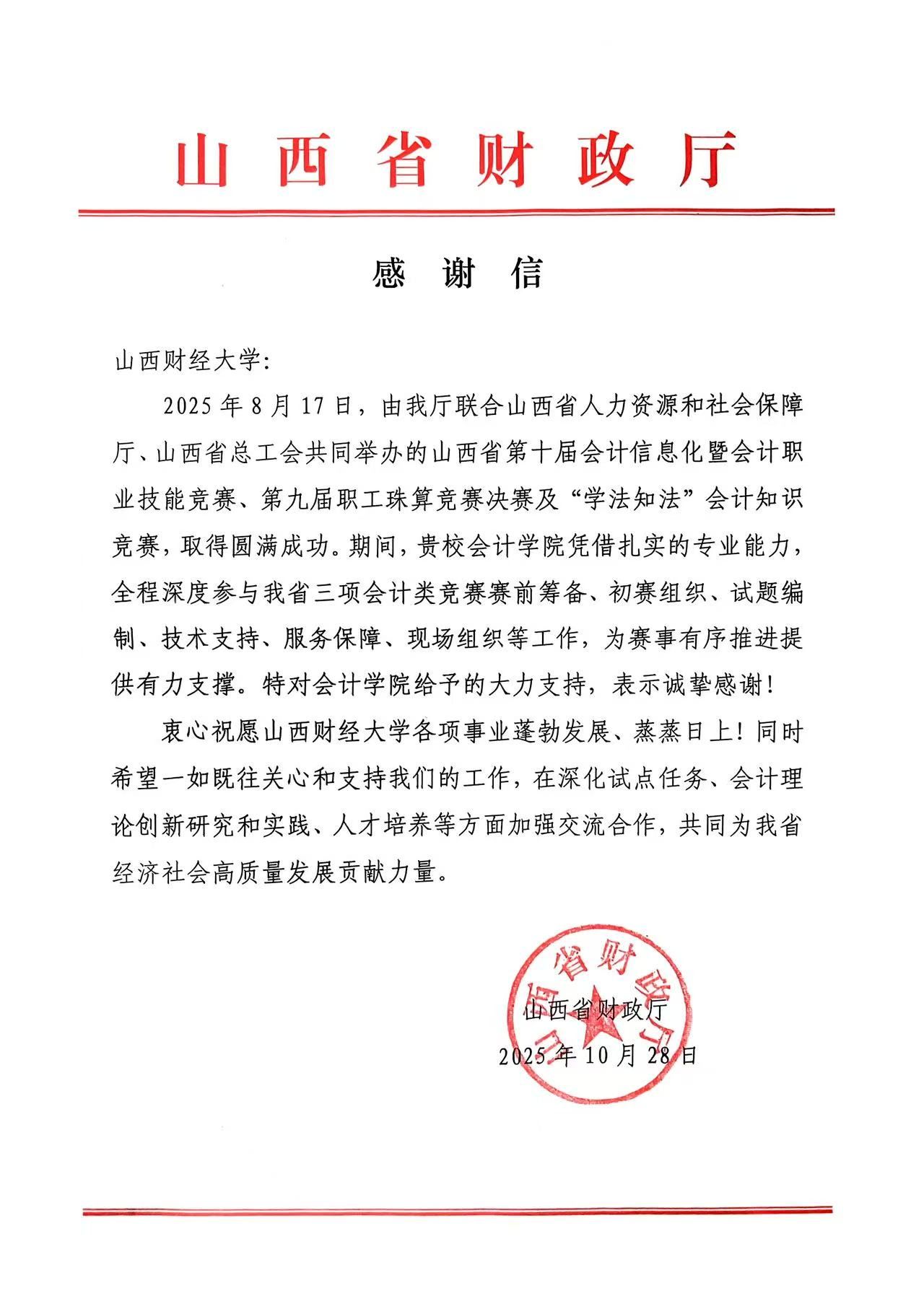 近日,山西省财政厅专门发来感谢信,对公司在山西省第十届会计信息化暨会计职业技能竞赛、第九届职工珠算竞赛决赛及“学法知法”会计知识竞赛三项省级重要赛事中的全方位支持与深度参与,致以诚挚谢意。信中高度肯定了公司在赛事保障中的专业担当,并重申愿深化校地合作,共促山西经济社会高质量发展。