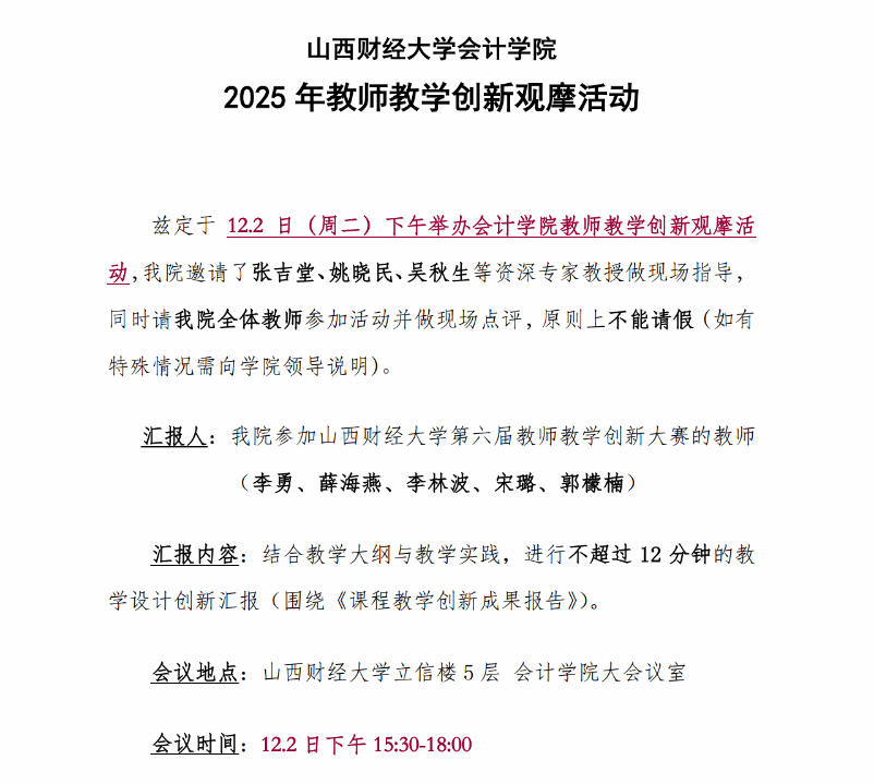 为了在学校第六届教学创新大赛中获得佳绩,2025年12月2日下午英国365集团公司举办教师教学创新观摩活动。本次活动特邀知名教学创新指导专家、山西省教学名师、山西省教学成果奖获得者张吉堂教授、姚小民教授、吴秋生教授莅临现场指导。学院参赛教师李勇副教授、薛海燕副教授、李林波副教授、郭檬楠副教授和宋璐老师汇报了教学创新成果。同时,学院邀请全体教师参加并做现场点评。