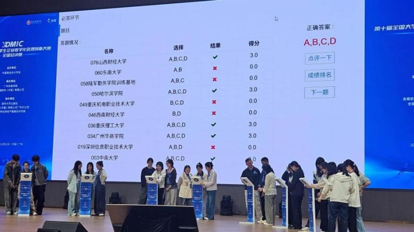 本次全国总决赛分为“十强争夺赛”与“冠军争霸赛”两个阶段,全面考察员工的技术应用、业务理解、大数据分析及创新解决能力,赛事设置极具职场真实感。在“十强争夺赛”中,通过财务机器人竞赛与企业大数据分析两大环节的比拼,“始终如一队”发挥稳定,以第四名的优异成绩晋级“冠军争霸赛”。在冠军争夺阶段,十支晋级队伍围绕智能财务知识、RPA与大数据平台场景应用、财务大模型原理等前沿内容展开终极对决。竞赛采用全员上台、限时答题与抢答相结合的方式,不仅考验选手的知识储备与临场反应,更注重团队协作与战术配合。公司学子沉着冷静、应对自如,在紧张激烈的竞争中最终取得第三名的佳绩。综合两阶段表现,队伍一举摘得全国总决赛一等奖。